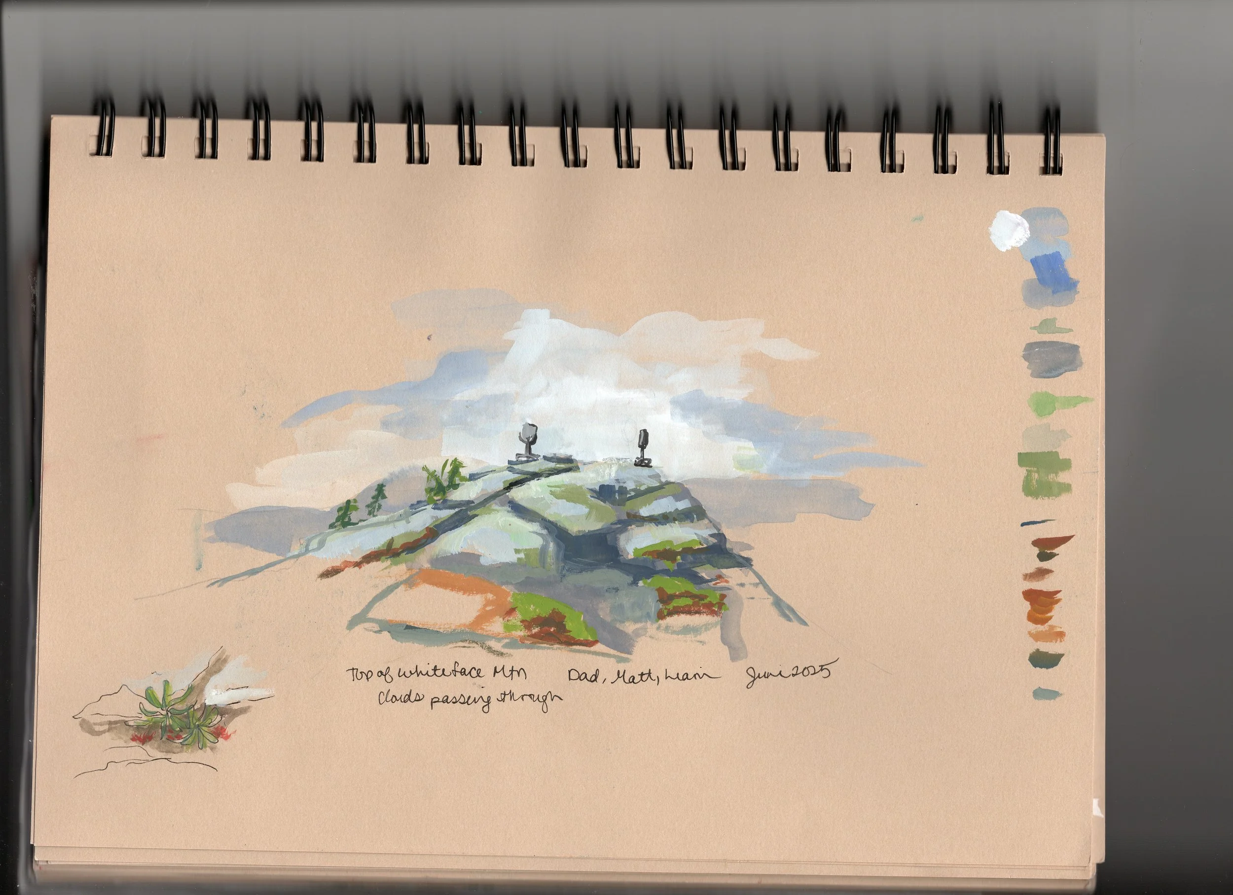 At the top of Whiteface Mountain, reaching the summit was an adventure in itself—we had to drive and then hike a rocky path to get there. Once we arrived, mist kept rolling in, obscuring our view of the lakes below. Every so often, the clouds would part, revealing breathtaking vistas that stretched for miles. I did a quick sketch of the muted colors and the vibrant lichen (or was it moss?) clinging to the steep cliffs. My biggest challenge there was value—the subtle tones of the mountain blended with the stark whiteness of the mist.